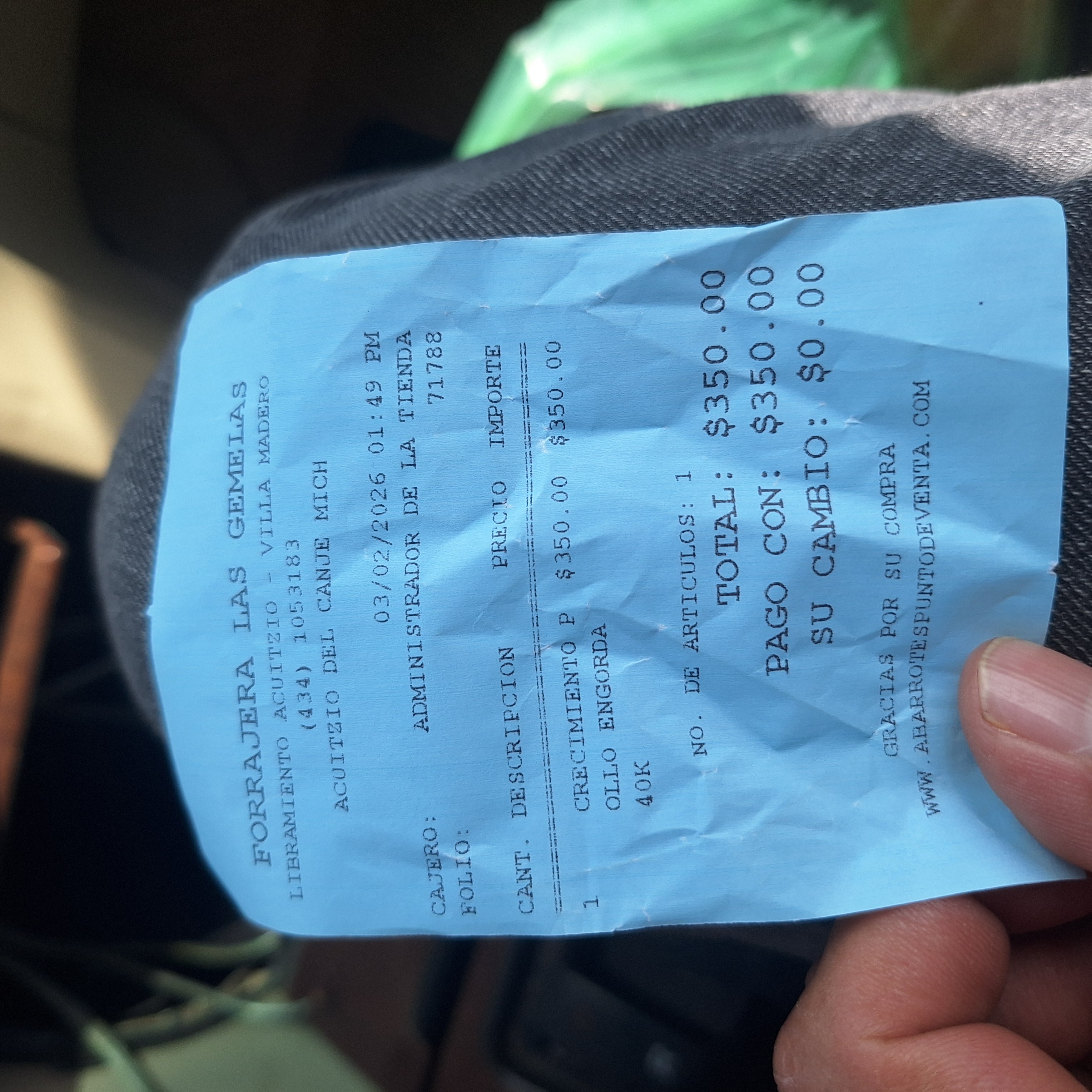 | 2026-02-17 | Crispin | Alimento | Nogal ponedora | 780.00 | Primera compra de alimento de postura en forrajera de los viejos sabros | Ver archivo | |