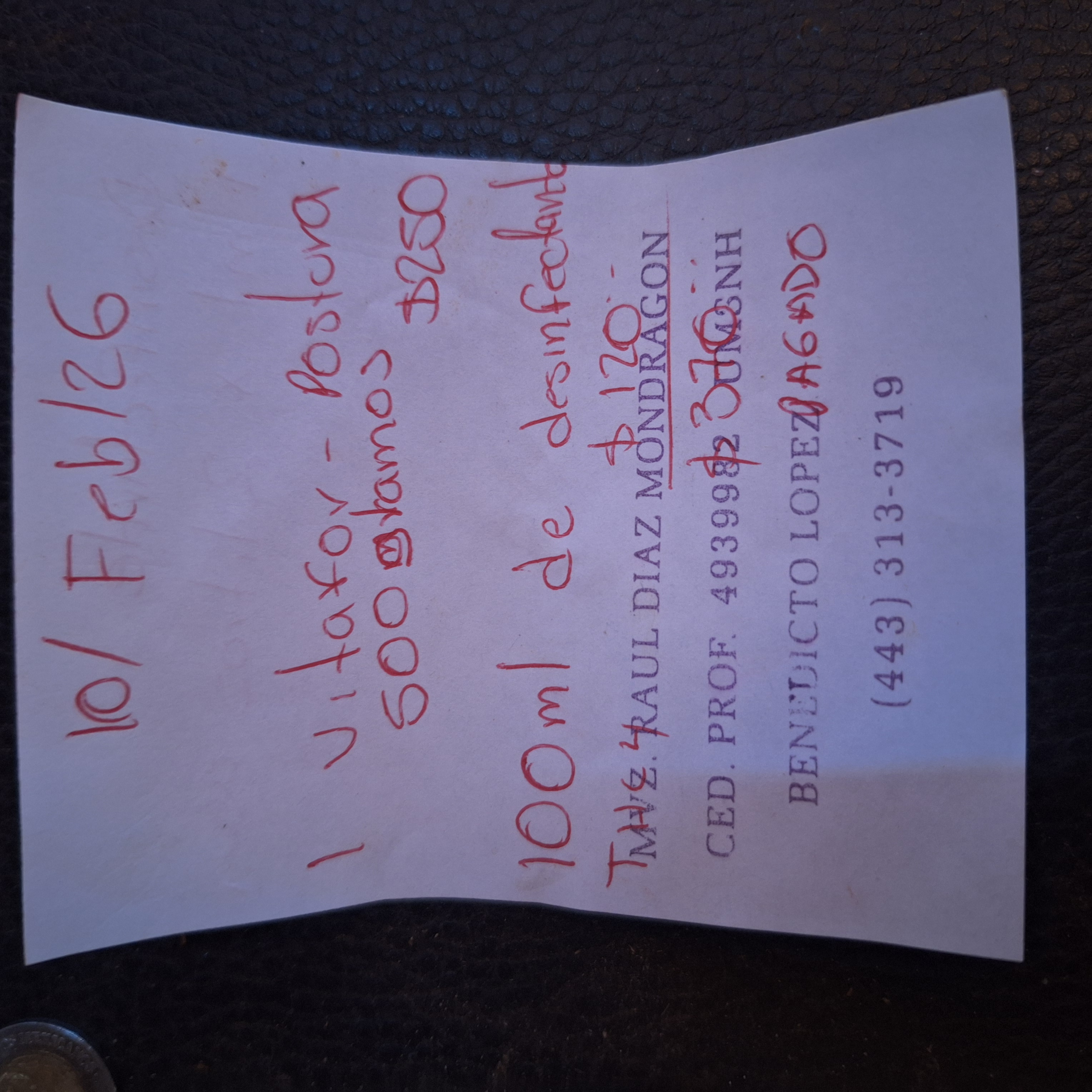 | 2026-02-10 | Crispin | Salud | Vitafor postura 500 gr y thc 100 ml desinfectante | 370.00 | Un mililitro de desinfectante por 2 l de agua para desinfectar el galpon Y un mililitro por 4 l de agua para desinfectar el 谩rea de los huevos | Ver archivo | |